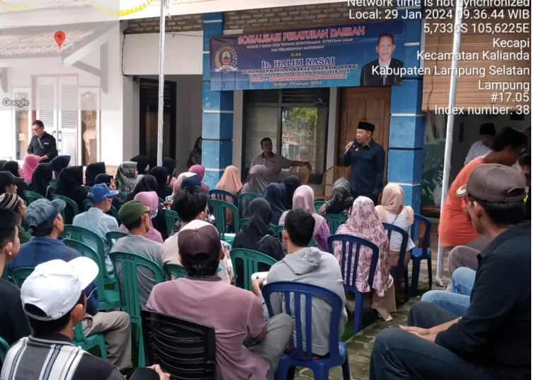 Lampung Selatan – Anggota DPRD Lampung Selatan, Halim Nasai menyapa konstituennya dalam bentuk kegiatan sosialisasi perda (sosper). Kali ini Legeslatif dari Fraksi PAN itu menyosialisasikan Perda Nomor 3 Tahun 2020 tentang Penyelenggaraan Ketenteraman,Ketertiban Umum dan Perlindungan Masyarakat.