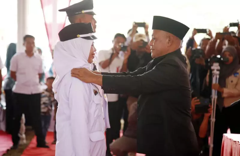 Lampung Selatan - Bupati Lampung Selatan H. Nanang Ermanto melantik Kepala Desa (kades) Purwotani dan Sinar Rejeki dari Kecamatan Jati Agung hasil Pemilihan Kepala Desa (Pilkades) Serentak Gelombang II pada 31 Agustus 2023 lalu. Prosesi pelantikan dan serah terima jabatan berlangsung di Lapangan Desa Purwotani, Kecamatan Jati Agung, Rabu (6/9/2023).