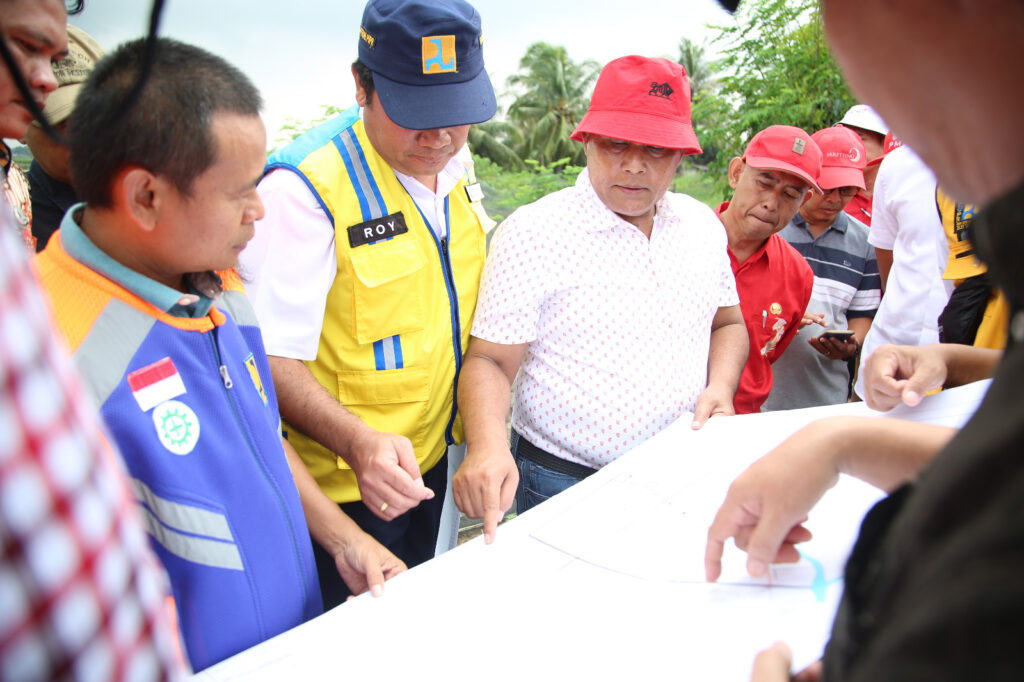 Lampung Selatan - Bupati Lampung Selatan H. Nanang Ermanto didampingi Dinas Pekerjaan Umum dan Perumahan Rakyat (PUPR) melakukan peninjauan irigasi bersama Balai Besar Pengairan dan Irigasi Wilayah Mesuji – Lampung di Desa Bandar Agung Kecamatan Sragi, Sabtu (15/7/2023).