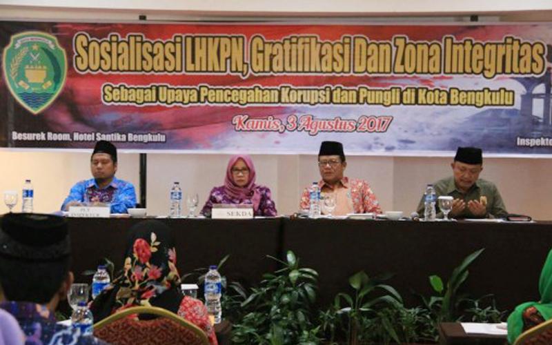 Kota Bengkulu – Upaya Pemerintah Kota Bengkulu dalam meminimalisir pratik-praktik korupsi, gratifikasi dan pungutan liar (pungli) terus dilakukan secara intensif. Mulai dari himbauan hingga penyempurnaan sistem pelaporan semakin ditingkatkan. Bertempat di ruang pertemuan Besurek Hotel Santika Bengkulu, Inspektorat kota Bengkulu mengadakan Sosialisasi Laporan Hasil Kekayaan Pejabat Negara (LHKPN), Gratifikasi dan Zona Integritas sebagai upaya pencegahan korupsi dan pungli di Kota Bengkulu. Kegiatan yang dilakukan Kamis (3/8) pagi ini melibatkan 53 Organisasi Perangkat Daerah (OPD) dilingkup Kota Bengkulu.
