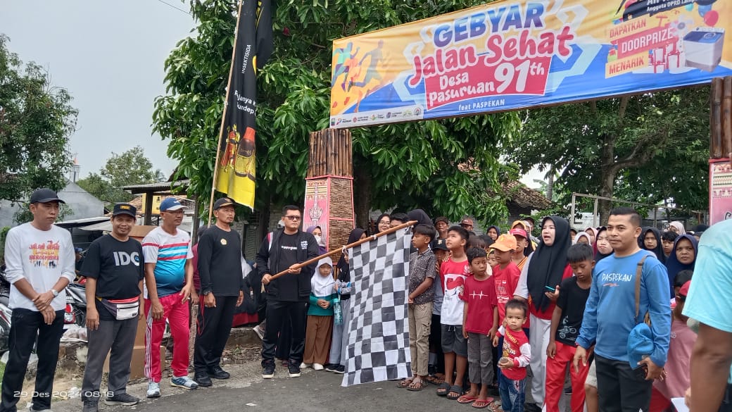 Lampung Selatan - Pemerintahan Desa Pasuruan, Kecamatan Penengahan, Kabupaten Lampung Selatan (Lamsel) menggelar Gebyar Jalan Sehat, dalam rangka memperingati Hari Ulang Tahun (HUT) Desa ke-91 di tahun 2024, khusus untuk warga setempat, Minggu (29/12/2024).
