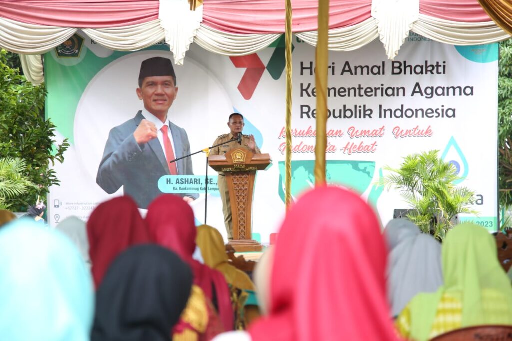 Kepala Kementerian Agama Lampung Selatan H. Ashari, SE., M.Pd.I dalam sambutannya mengatakan, peringatan HAB Kemenag 2023 mengusung tema “Kerukunan Umat Untuk Indonesia Hebat”.