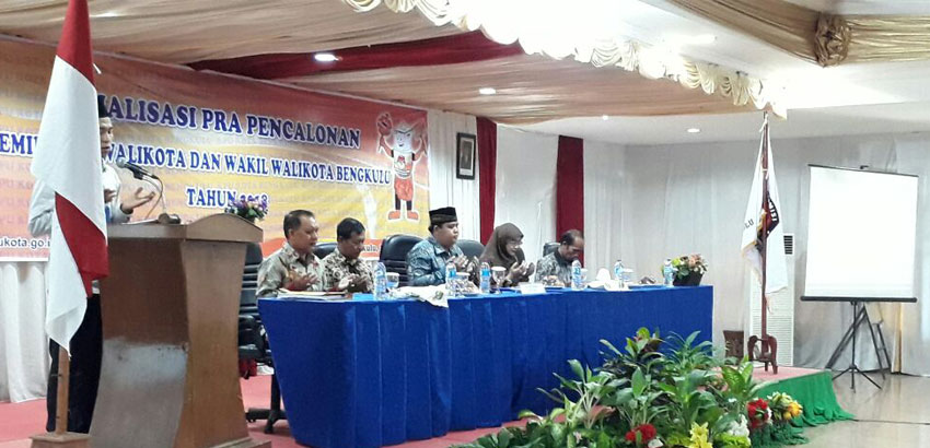 Bengkulu - Komisi Pemilihan Umum Kota Bengkulu melakukan kegiatan Sosialisasi Pra Pencalonan Pemilihan Walikota dan Wakil Walikota Bengkulu Tahun 2018, Rabu (30/08/2017) di Raffles City Hotel, Pantai Panjang, Kota Bengkulu.