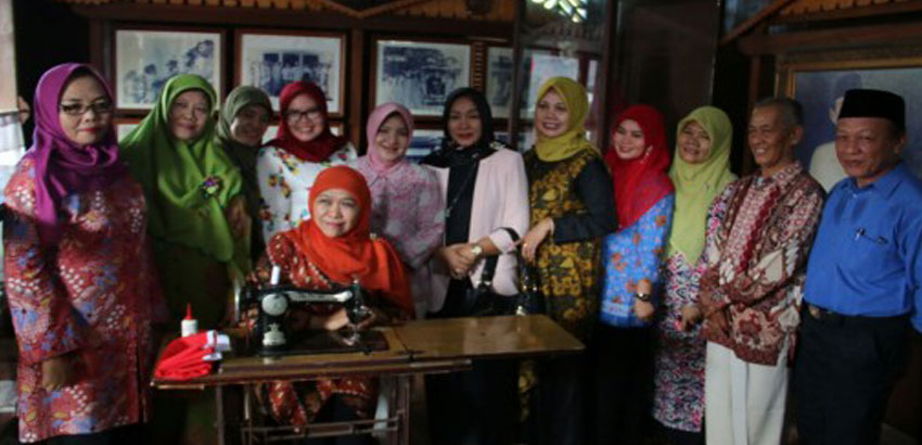 Menteri Sosial RI Khofifah Indar Parawansa saat memegang mesin jahit yang sempat menjadi saksi sejarah lahirnya Bendera Pusaka Merah Putih.