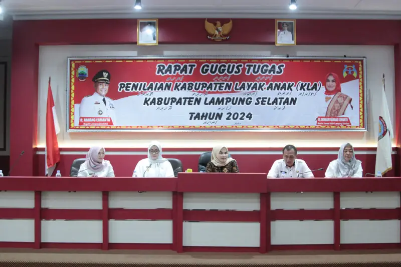 Lampung Selatan - Pemerintah Kabupaten (Pemkab) Lampung Selatan menyelenggarakan Rapat Gugus Tugas Kabupaten Layak Anak (KLA) di Aula Rajabasa, kantor bupati setempat. Kegiatan ini dilaksanakan dengan tujuan menyampaikan evaluasi terhadap penilaian KLA 2023, dan persiapan dalam penilaian KLA tahun 2024, Rabu (6/3/2024).