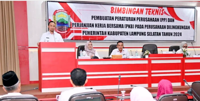 Lampung Selatan - Pelaksana tugas (Plt) Bupati Lampung Selatan, Pandu Kesuma Dewangsa, S.I.P., membuka Bimbingan Teknis (Bimtek) terkait dengan pembuatan Peraturan Perusahaan (PP) dan Perjanjian Kerja Bersama (PKB) bagi perusahaan. Kegiatan Bimtek digelar di Aula Krakatau, Kantor Bupati Lampung Selatan, pada Rabu (23/10/2024).